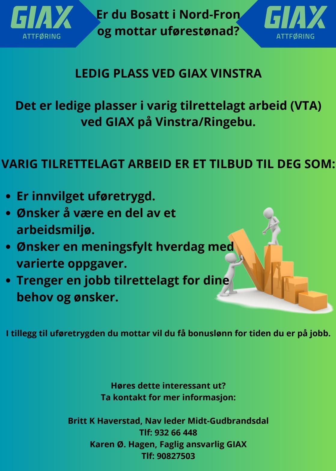 Ledig plass ved GIAX VinstraDet er ledige plasser i varig tilrettelagt arbeid (VTA) ved GIAX på Vinstra/Ringebu. Publisert 11.02.2026 10.16 Sist endra 11.02.2026 10.40