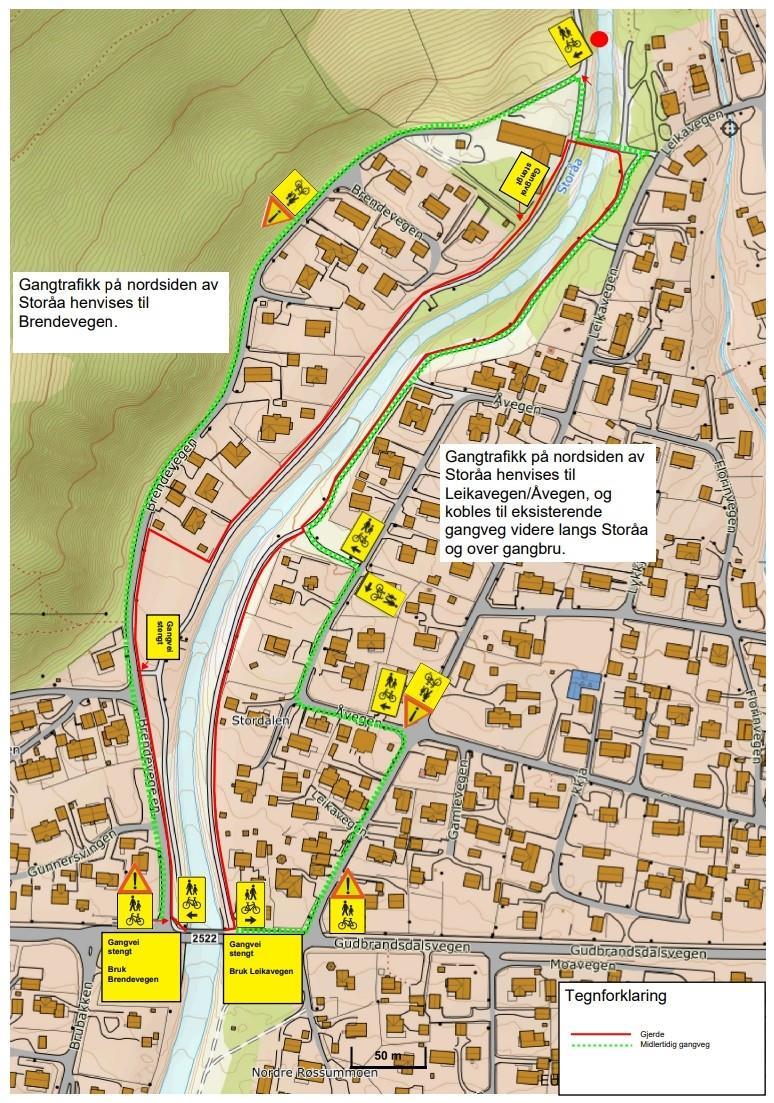 • I perioder vil enkelte gangveier langs Storåa bli stengt.