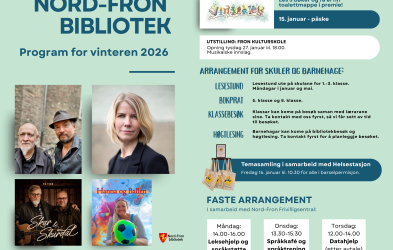 Velkommen til Nord-Fron bibliotek!Nord-Fron biblioteket Nord-Fron Kommune Nord-Fron bibliotek ligg i Nedregate 50 på Vinstra, i 1. etasje på kommunehuset.Biblioteket har eit stort og variert utval av bøker, lydbøker og filmar for alle aldersgrupper. Det vi ikkje har kan vi hjelpe deg med å få tak i. Vi har eit utval aviser og tidsskrift, og vi har arbeidsplassar, PC-ar og trådlaust nett. Ute ved inngangsdøra til biblioteket er det eiga luke for innlevering av lånt materiale utanom opningstid. Lånekort og pin-kode får du på biblioteket.Her kan du søke i basen vår, reservere bøker og fornye lån.Velkommen til oss! Publisert 20.01.2022 14.12 Sist endra 05.01.2026 09.12